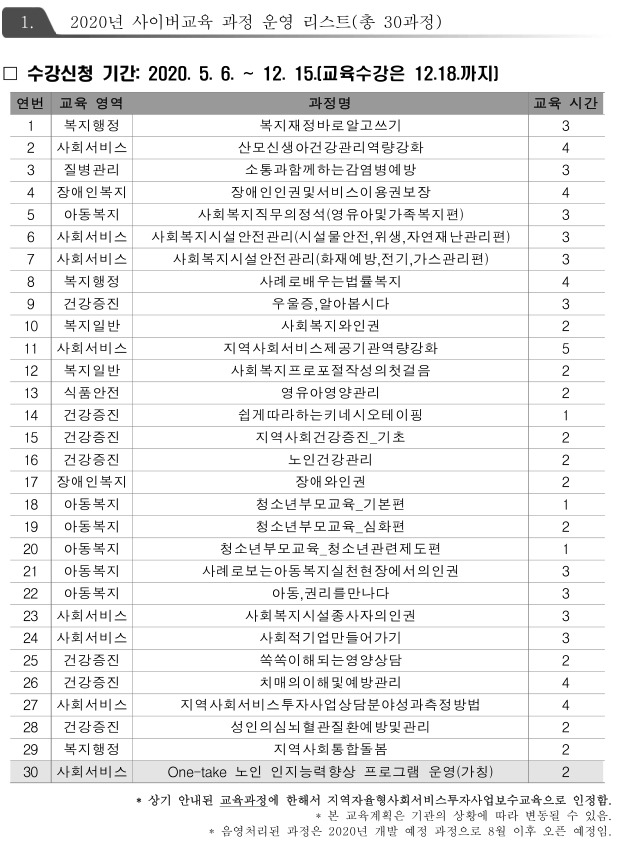 | 교육명 | 2020년 한국보건복지인력개발원 사이버 교육 | 교육일시 | 2020년 5월 6일 ~ 12월 15일 |