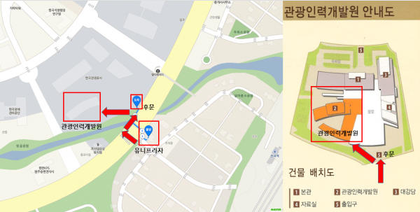 ■ 교육내용 <지역자율형 사회서비스 투자사업 경영관리 직무교육> - 사회서비스 제공기관 인사노무 - 사회서비스 제공기관 경영마케팅 ■ 교육대상 <지역자율형 사회서비스 투자사업 경영관리 직무교육> - 지역자율형 사회서비스 투자사업 제공기관 대표자 및 관리책임자 ■ 세부일정 - 9시 ~ 13시 : 지역자율형 사회서비스 투자사업 경영관리 직무교육(기관 대표 및 관리책임자만 신청 가능) ■ 신청방법 : 한국보건복지인력개발원 홈페이지(www.kohi.or.kr)에서 회원가입 후 개별 신청 - 수강신청방법 : 한국보건복지인력개발원 홈페이지 회원가입→교육안내→'강원'검색→ 지역자율형 투자사업 경영관리(강원) 선택 후 수강신청 - 4월 3일 교육이 2개 진행될 예정으로 반드시 1) 경영관리 9시~13시(대표, 관리책임자 대상) 2) 서비스관리 14시~18시(대표, 관리책임자, 제공인력 대상) 교육을 구분하시어 해당되는 교육에 신청을 해주시기 바랍니다. ■ 기타사항 - 신분증 지참 필수 - 교육별로 교육 4시간씩 인정 ■ 교육장소 위치 - 한국관광공사 관광인력개발원 1층 대강의실 (백두실) / 원주시 세계로 10 소재 * 관광인력개발원은 한국관광공사 후문쪽에 위치(위의 지도에 표시) ■ 주차안내 - 건물 내 주차장 이용이 불가하오니 자가용 이용시 후문 건너편에 위치한 유니프라자 뒤쪽의 도로 또는 공터에 주차하시기 바랍니다.(유니프라자->후문 도보 1분 소요) * 내비게이션 이용 시 유니프라자(강원도 원주시 달마중3길 1)로 지정 후 찾아오시면 됩니다. ■ 유의사항 - 회의실 내 음식물 반입금지 - 구내식당 이용불가 ■ 문의: 250-2946 |