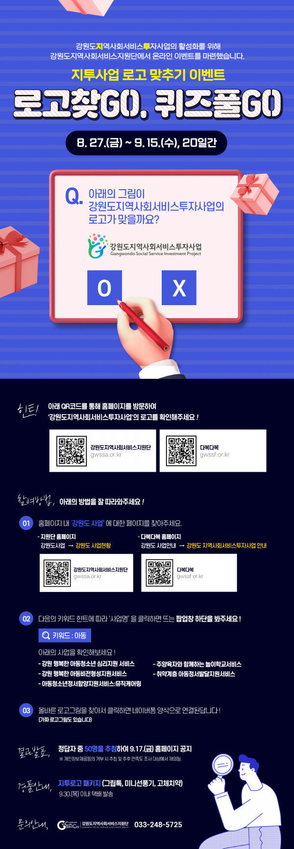| ○ 이벤트명: 강원도지역사회서비스투자사업 “로고찾GO 퀴즈풀GO” | ||||||||||