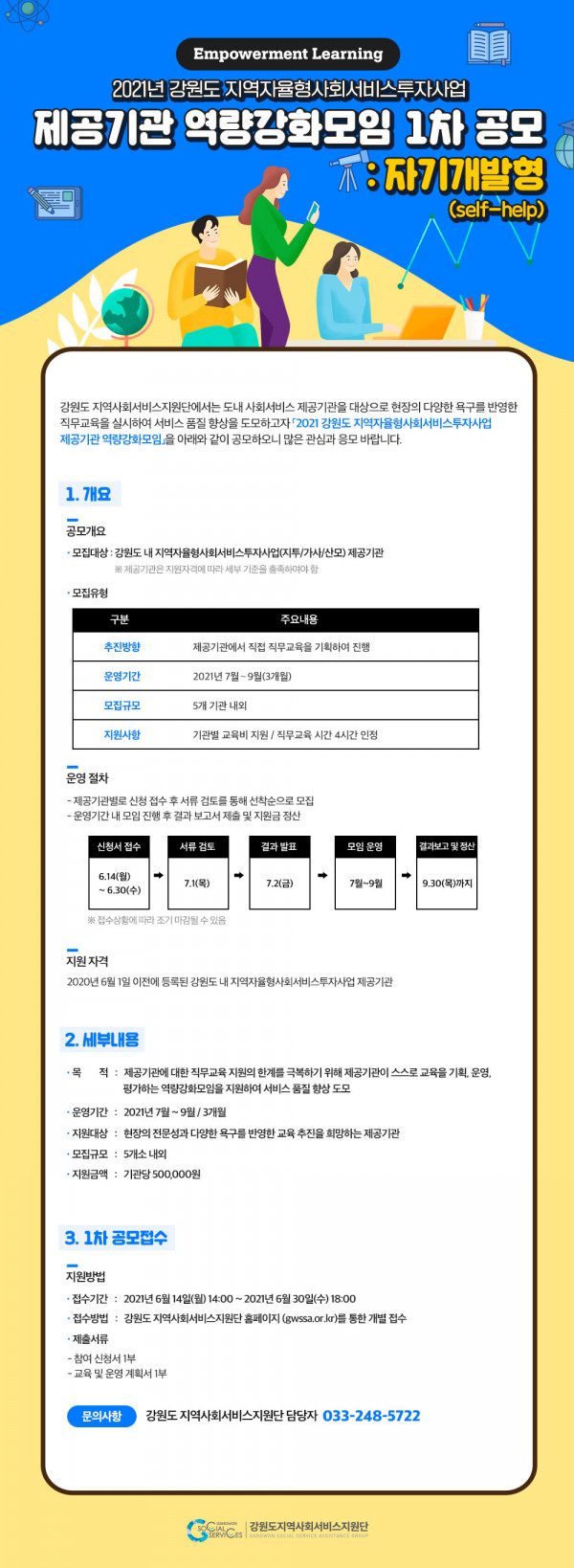강원도 지역사회서비스지원단에서는 도내 사회서비스 제공기관을 대상으로 현장의 다양한 욕구를 반영한 직무교육을 실시하여 서비스 품질 향상을 도모하고자 '2021 강원도 지역자율형사회서비스투자사업 제공기관 역량강화모임'을 아래와 같이 공모하오니 많은 관심과 응모 바랍니다.