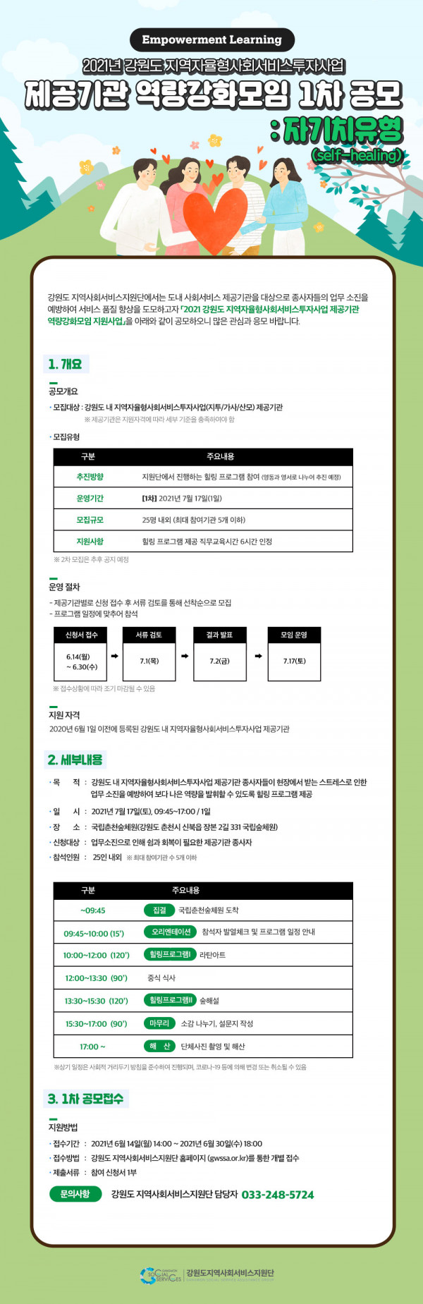 강원도 지역사회서비스지원단에서는 도내 사회서비스 제공기관을 대상으로 종사자들의 업무 소진을 예방하여 서비스 품질 향상을 도모하고자 '2021년 강원도 지역자율형사회서비스투자사업 제공기관 역량강화모임 지원사업'을 아래와 같이 공모하오니 많은 관심과 응모 바랍니다.