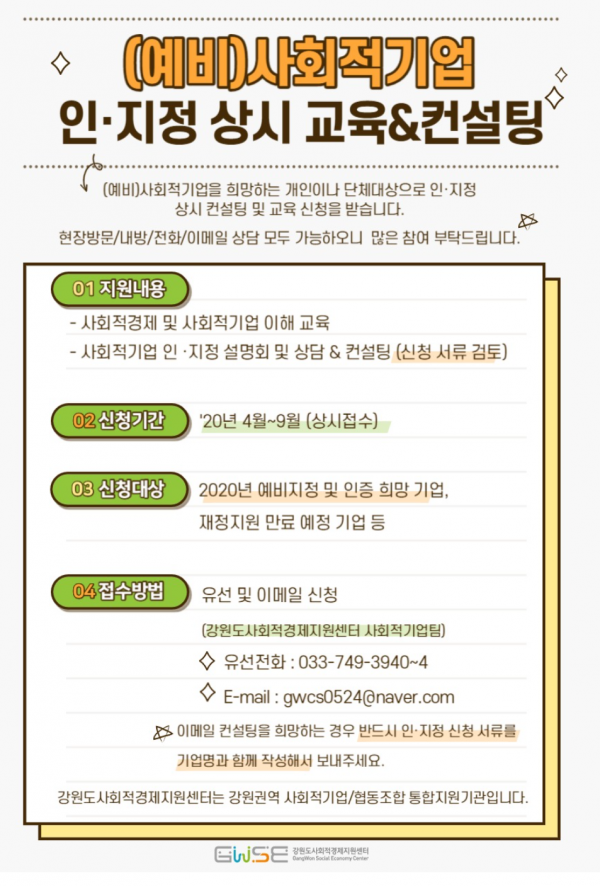 (재) 강원도사회적경제지원센터 주관의 (예비) 사회적기업 인,지정 상시 교육 및 컨설팅 실시 관련 안내입니다.