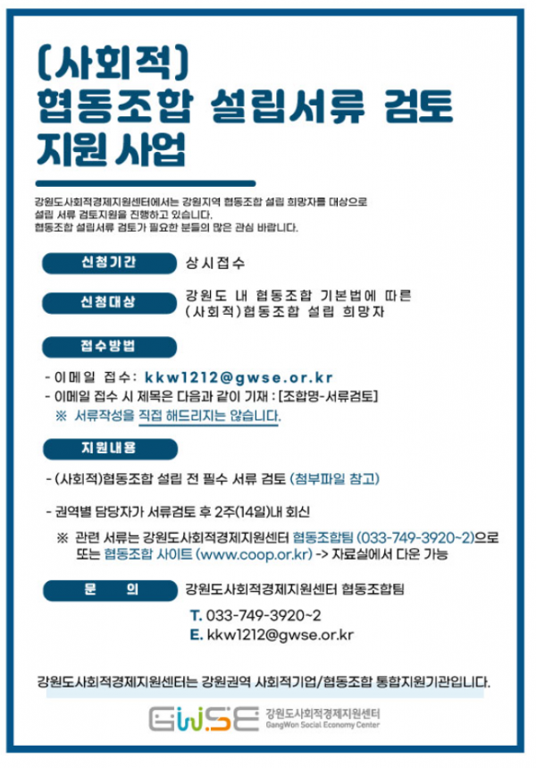 강원도사회적경제지원센터의 (사회적)협동조합 설립서류 검토 지원사업 안내입니다.