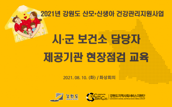 8월 10일 강원도지역사회서비스지원단에서는 [2021년 강원도 산모·신생아 건강관리지원사업 시·군 담당자 대상 현장점검 교육]을 개최하였습니다.
