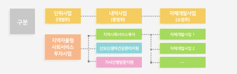 - (지역사회서비스 투자사업) 서비스 지방자치단체가 지역 특성 및 주민 수요에 맞게 발굴·기획한 사회서비스 지원 - (산모신생아 건강관리 지원사업) 출산 가정에 산모·신생아건강관리사를 통한 가정방문 서비스 지원 - (가사간병 방문지원사업) 신체적·정신적 이유로 원활한 일상생활과 사회활동이 어려운 저소득 취약계층에게 재가간병·가사지원 서비스 지원